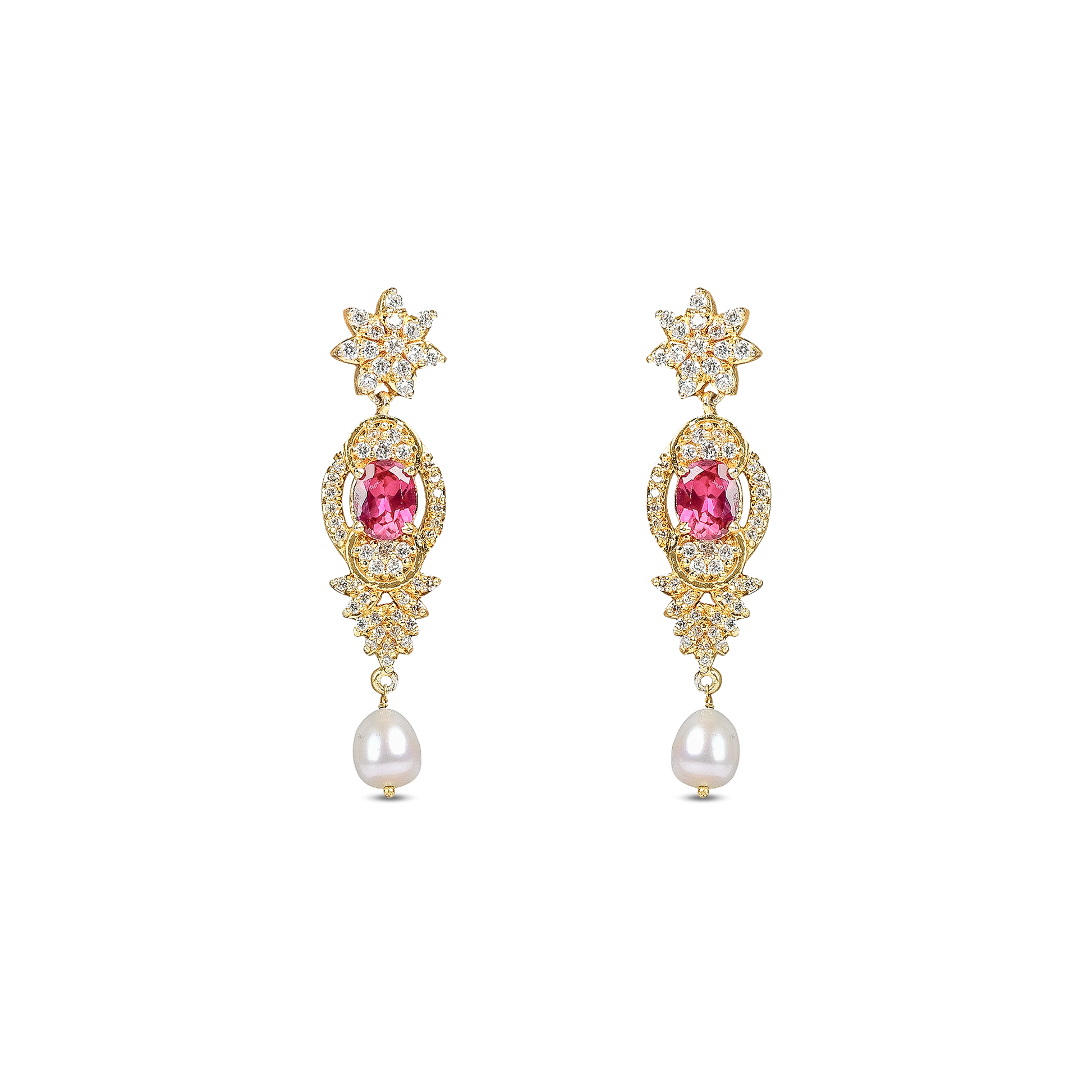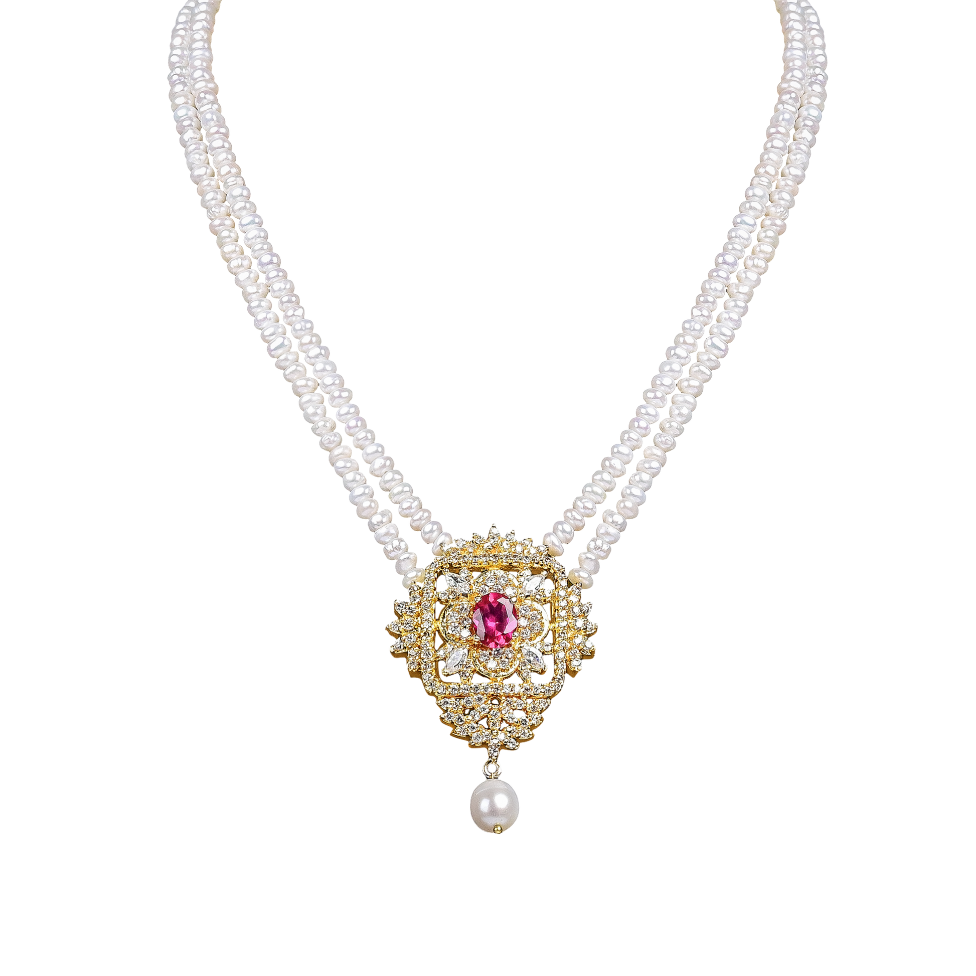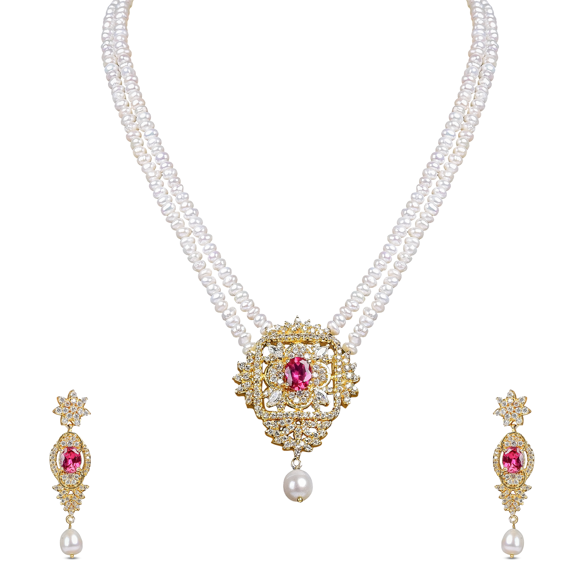 Grace your look with this elegant freshwater white pearl set, beautifully paired with a red and white A.D. stone pendant and matching earrings. The soft luster of the pearls contrasts perfectly with the vibrant stones, creating a classic yet eye-catching appeal. Ideal for traditional events or festive gatherings, this set adds a touch of timeless charm. A graceful blend of elegance and color.