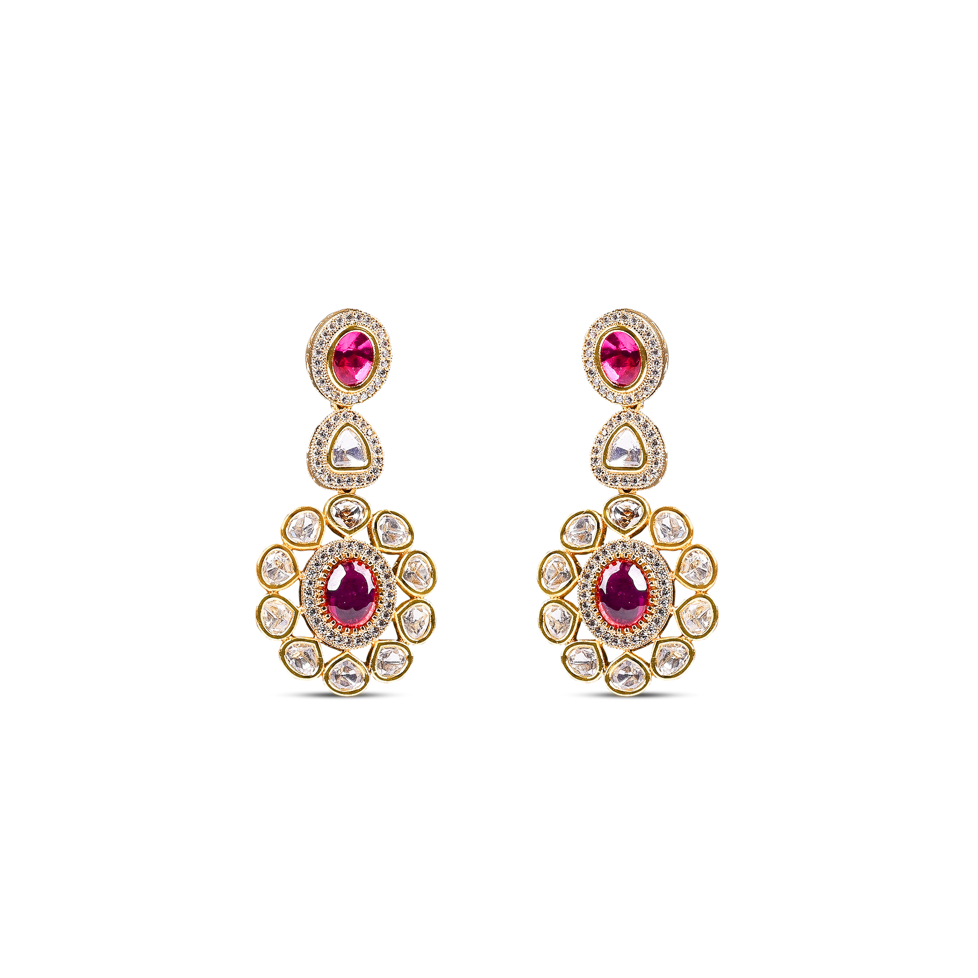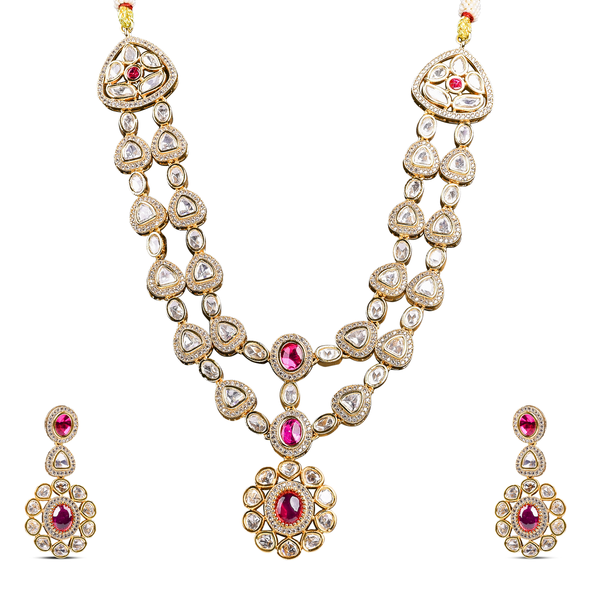 Make a grand statement with this regal 2-line Moissanite set, accented with rich ruby red stones. The brilliance of Moissanite pairs beautifully with the deep red hues, creating a luxurious and elegant look. Designed to exude royal charm, this set is perfect for weddings, celebrations, or special occasions. A timeless piece that adds sophistication to any ensemble.