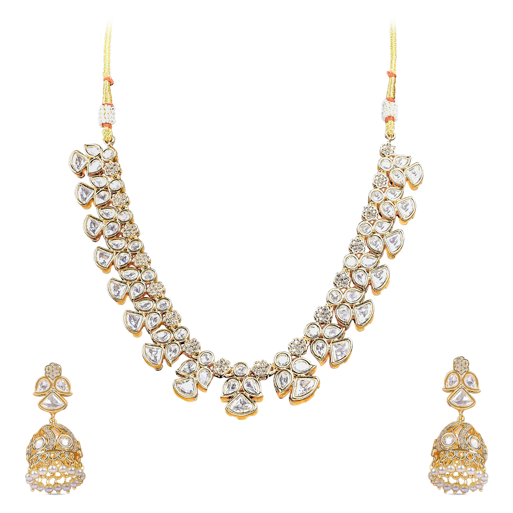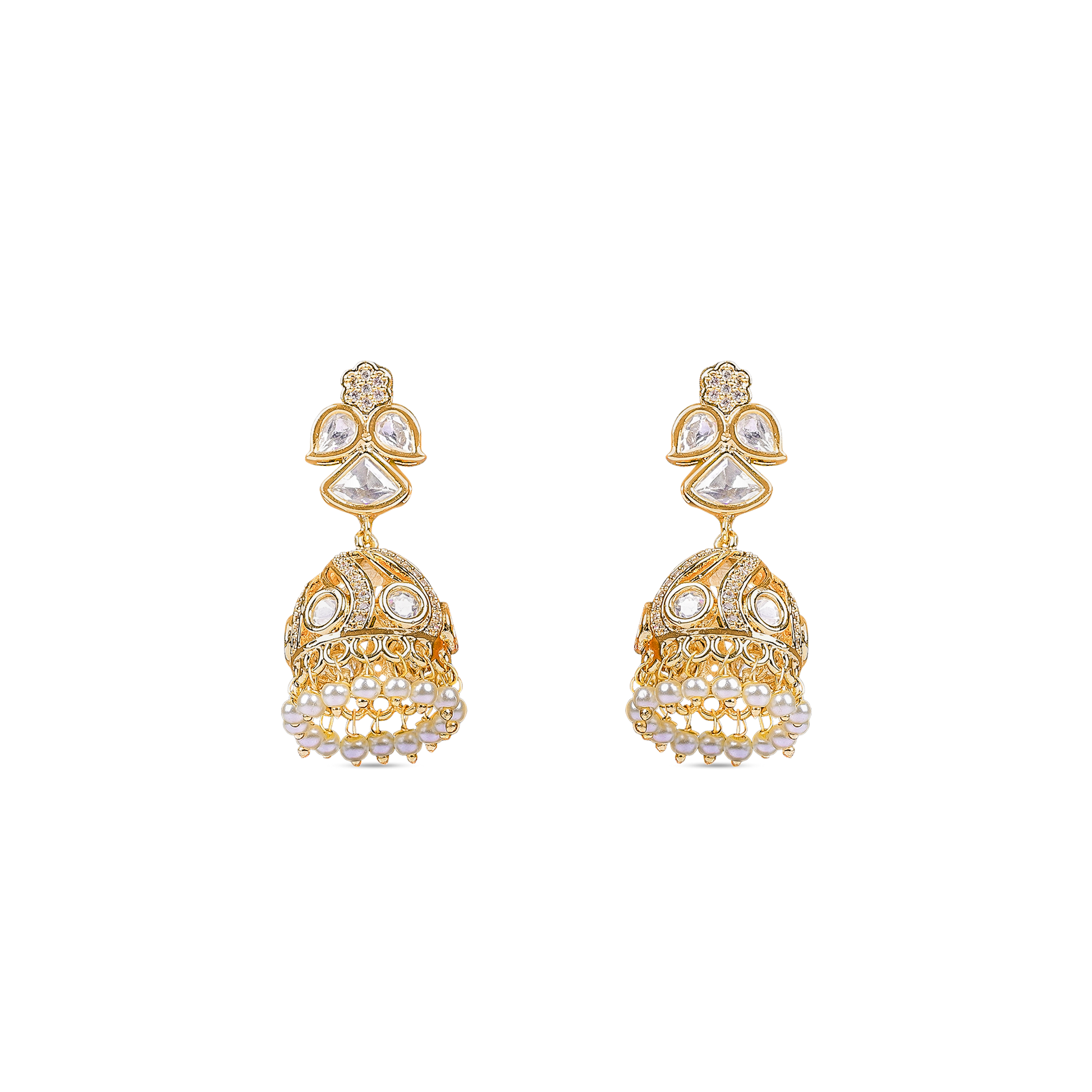 Elevate your traditional look with this full Moissanite setting set, beautifully paired with classic jhumkas. The dazzling Moissanite stones offer unmatched brilliance, adding a regal touch to every detail. Designed as a royal set, it exudes timeless charm and sophistication. Perfect for weddings, festive events, or special occasions that call for elegance.